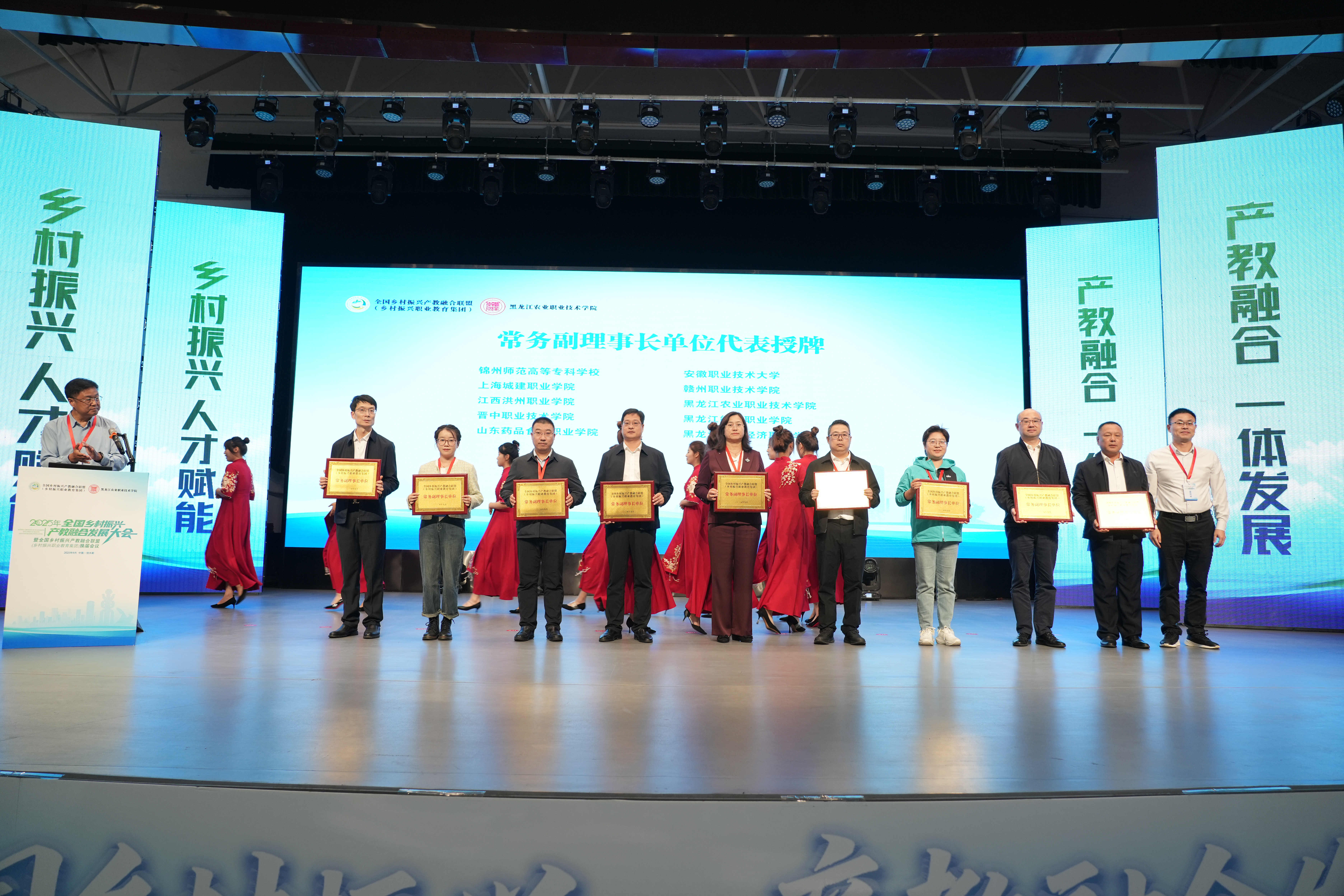 会议汇聚了来自政府部门、本科高校、职业院校、行业企业、科研机构等200余位代表,共同探讨教育、科技、人才深度融合,助力乡村振兴的路径与机制。在大会联盟理事会换届仪式上,我校凭借在服务乡村振兴战略、深化产教融合方面的扎实工作和显著成效,获任“第二届全国乡村振兴产教融合联盟(乡村振兴职教集团)常务副理事长单位”。这一重要角色的获得,标志着我校在乡村振兴与产教融合领域的影响力获得国家层面认可。同时,副校长关爱国受聘为全国乡村振兴产教融合联盟(职教集团)专家委员会委员,将进一步参与联盟顶层设计与政策咨询工作。
