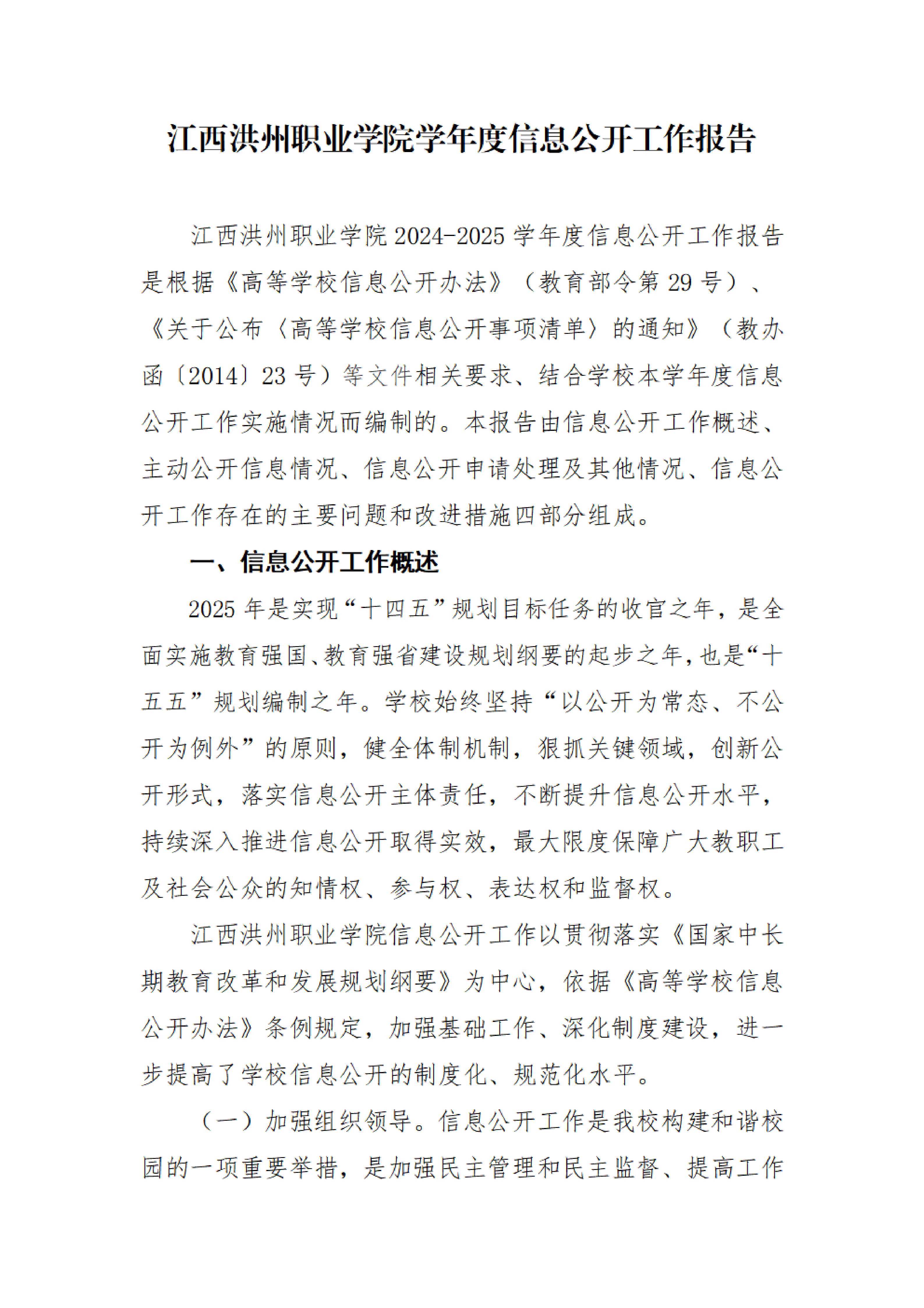 首页栏目 新闻综合 美丽校园 通知公告 下载中心 媒体关注 学校视频 通知公告 当前位置: 首页 > 首页栏目 > 通知公告 > 正文 江西洪州职业学院学年度信息公开工作报告(2024-2025) 时间:2025-10-31 责任编辑:李华丹 初审:李华丹 二审:陈玉清 终审:杨金平 阅读量:924 上一篇:江西洪州职业学院关于校园视觉识别系统(VIS)设计方案的征集公告 下一篇:关于严明 2025 年国庆节、中秋节期间廉洁纪律的工作提醒