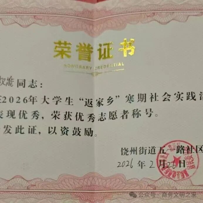 返家乡”社会实践活动,主动到江西省上饶市鄱阳县饶洲街道五一路社区做志愿服务。在服务过程中,他态度认真、责任心强,主动帮忙打扫卫生、宣传政策、引导文明行为、帮助居民解决日常问题,耐心解答大家的疑问,积极配合社区工作。不管事情多琐碎,他都认真对待、任劳任怨,用实际行动展现了当代大学生的青春担当。他踏实肯干、乐于奉献,得到了社区工作人员和居民的一致好评,是返乡青年志愿服务中的优秀代表。