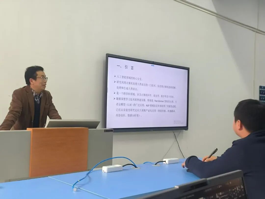 随后,教授结合技术发展历程展开讲解,他提到,随着深度学习技术的快速发展,尤其是Transformer架构的出现与大语言模型(LLM)的广泛应用,NLP领域迎来了突破性进展,早已从实验室的理论研究走向大规模产业化应用,智能客服、机器翻译、内容创作、情感分析等场景,都是其落地的典型范例。这一内容的讲解,让教师们直观感受到NLP技术与产业应用的紧密关联。
