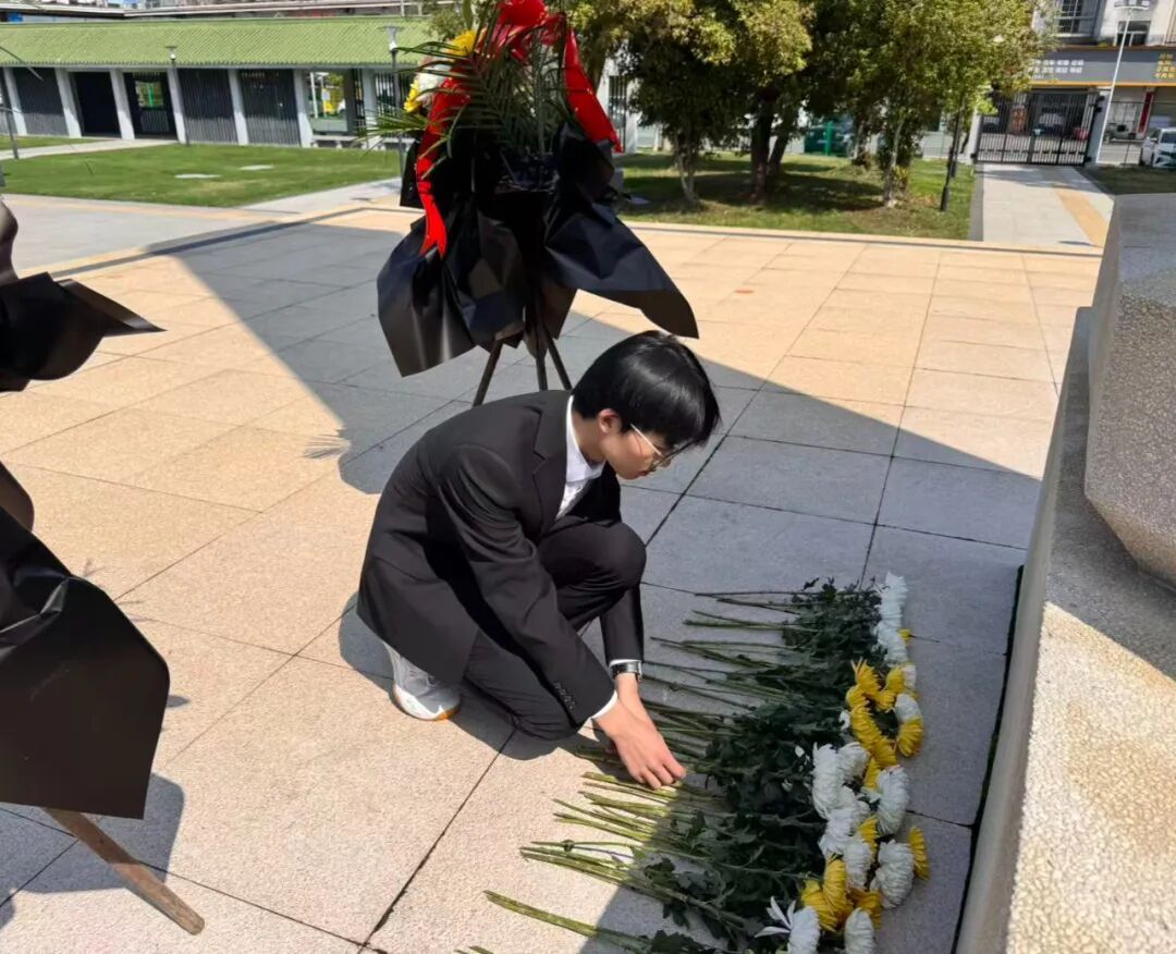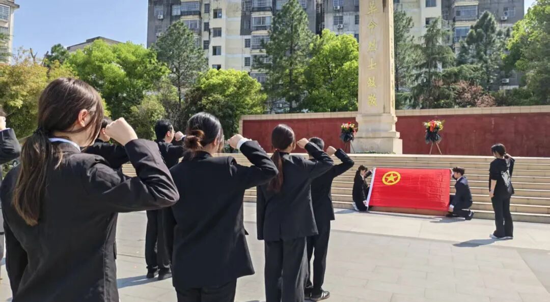 师生们身着正装、佩戴党员徽章和团员徽章,怀着崇敬之心抵达陵园。在烈士纪念碑前,敬献花篮、整理挽联,全体人员默哀,追思先烈峥嵘岁月。随后,团员们面向团旗,庄严宣誓,以铮铮誓言重温入团初心,坚定理想信念,许下为共产主义奋斗终身的承诺。