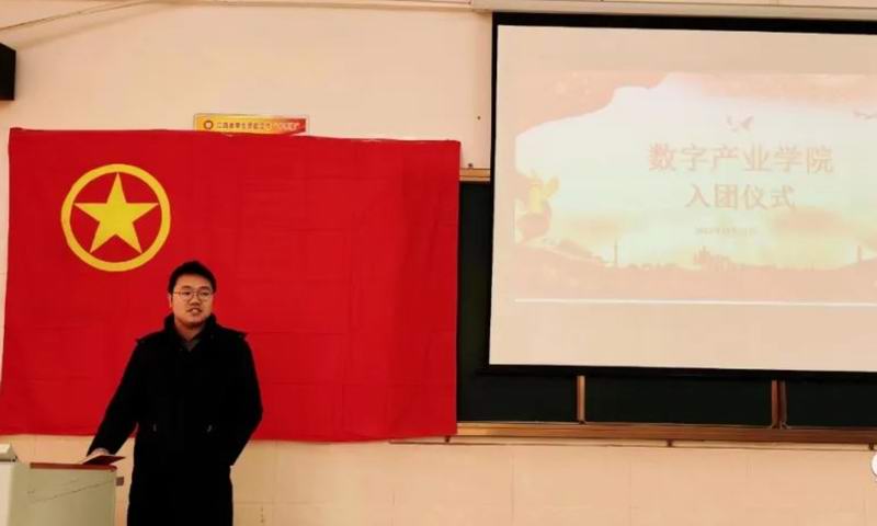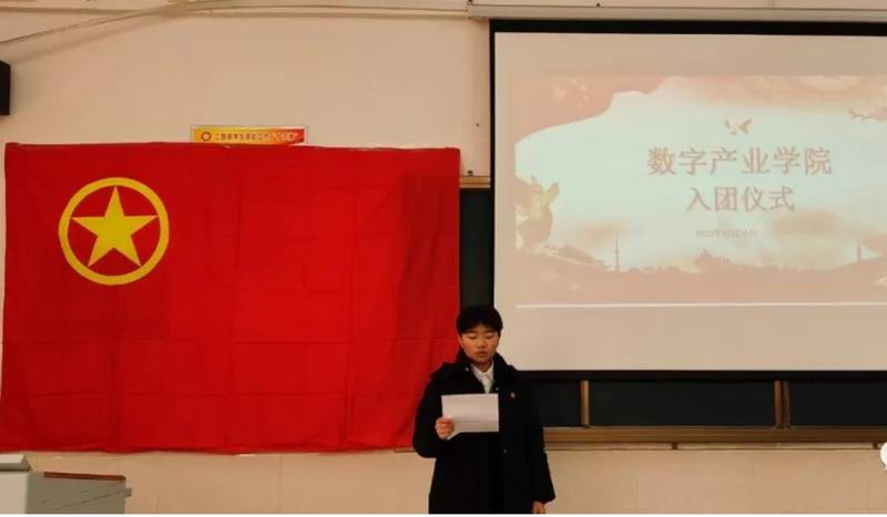 百年基业奠,赓续星火延。为向共青团注入新鲜血液,促进青年的进一步发展,增进共青团的生命力和战斗堡垒能力,数字产业学院于2023年12月21日举行入团仪式。参加此次仪式的人员有:党支部书记徐明、团总支书记钱倩文、各班团支书及新发展团员。