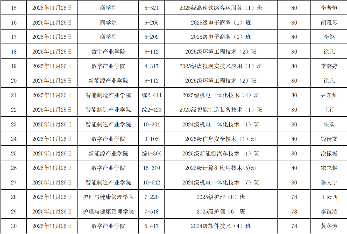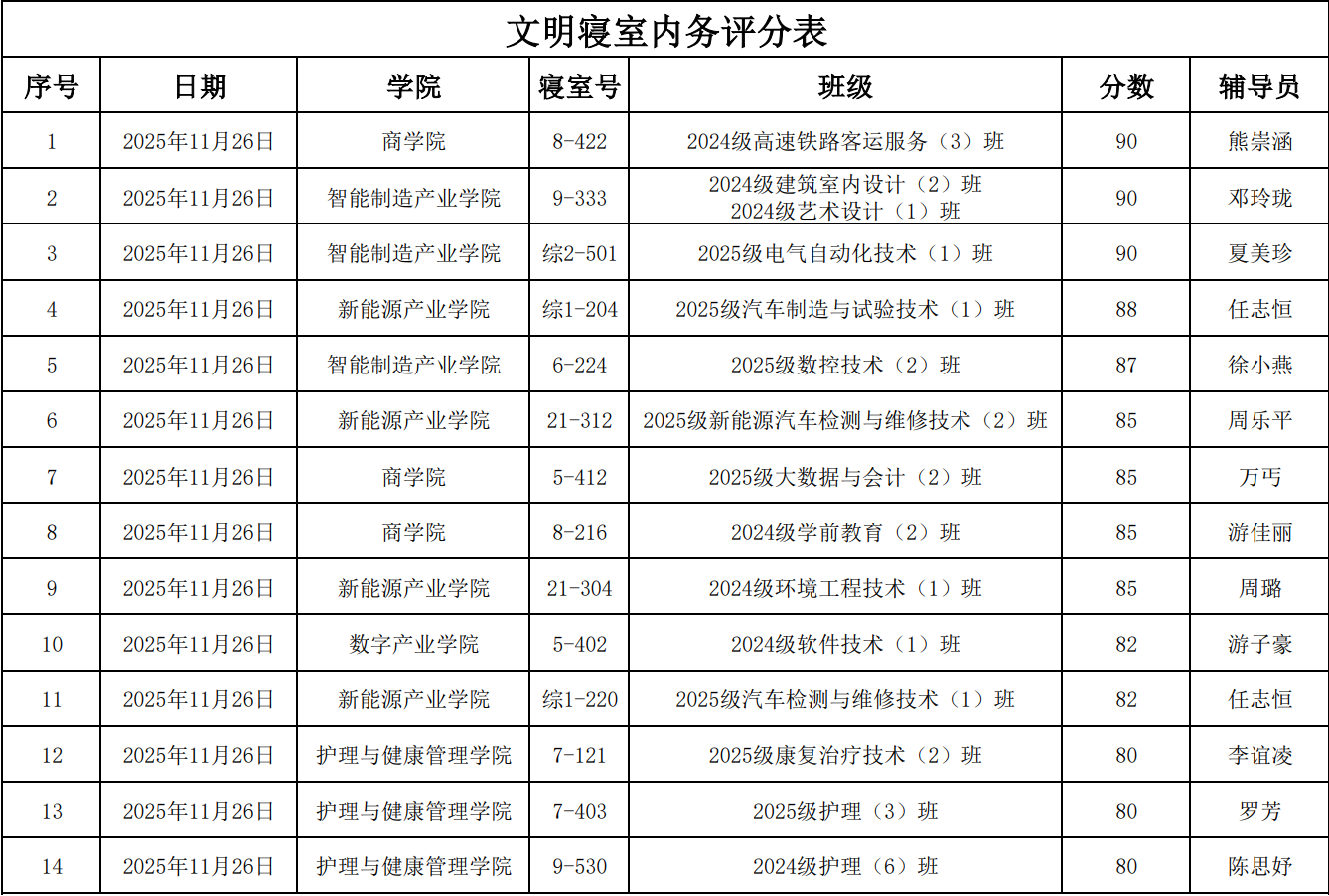 本次评比得到了各年级、各专业同学的积极响应与广泛参与。由辅导员、学生干部及校自管委成员共同组成的评审工作小组,秉持公平、公正、公开的原则,围绕“基础规范、卫生状况、安全底线、宿舍氛围”四大维度展开细致考评。经综合评议,最终共有30间寝室表现突出,获评“文明卫生寝室”荣誉称号,具体名单如下:
