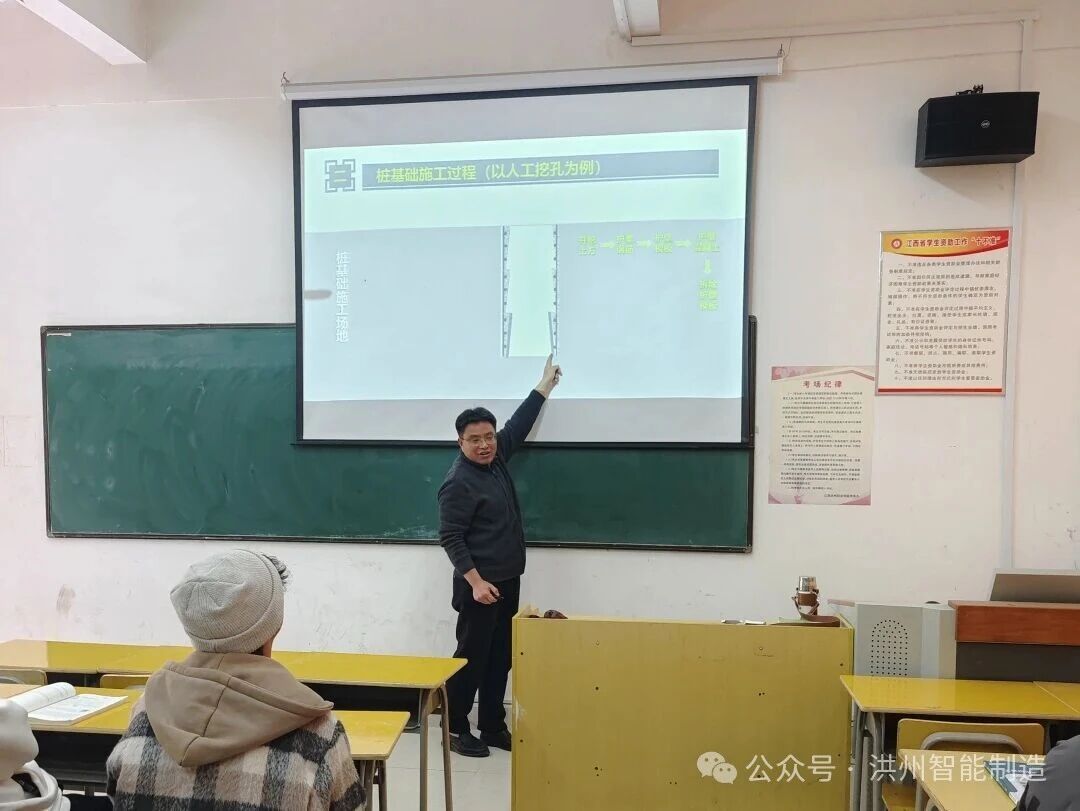 讲座现场,王永祥教授以建筑工程施工逻辑为主线,借助精心制作的PPT课件系统解构了从桩基础施工、地下室构建到上部建筑顺作法与逆作法的全流程体系。PPT中不仅包含清晰的施工流程图、各工序节点剖面图,更嵌入了动态施工仿真片段,将抽象的施工原理转化为直观可见的可视化内容。针对人工挖孔桩基础这一经典施工工艺,教授通过PPT分步展示场地勘测准备、分层土方开挖、护壁钢筋绑扎、模板支护、混凝土浇筑、模板拆除、桩底扩孔、钢筋笼下放及桩芯混凝土浇筑等核心工序,配合仿真模拟动画还原各环节操作细节与衔接逻辑,同时标注关键质量控制点的三维示意图,让学生对基础工程的施工精髓与质量管控逻辑一目了然。