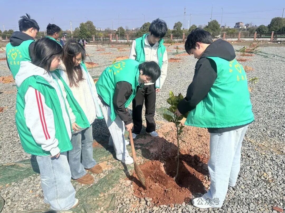 活动现场,师生们一同挥锹铲土、扶苗填坑、踏土夯实、浇水灌溉。大家分工协作、默契配合,现场呈现出一派热火朝天、朝气蓬勃的劳动景象。一棵棵新栽苗木迎风挺立、错落有致,为春日校园增添了盎然生机,也让“绿水青山就是金山银山”的理念在实践中落地生根、入脑入心。